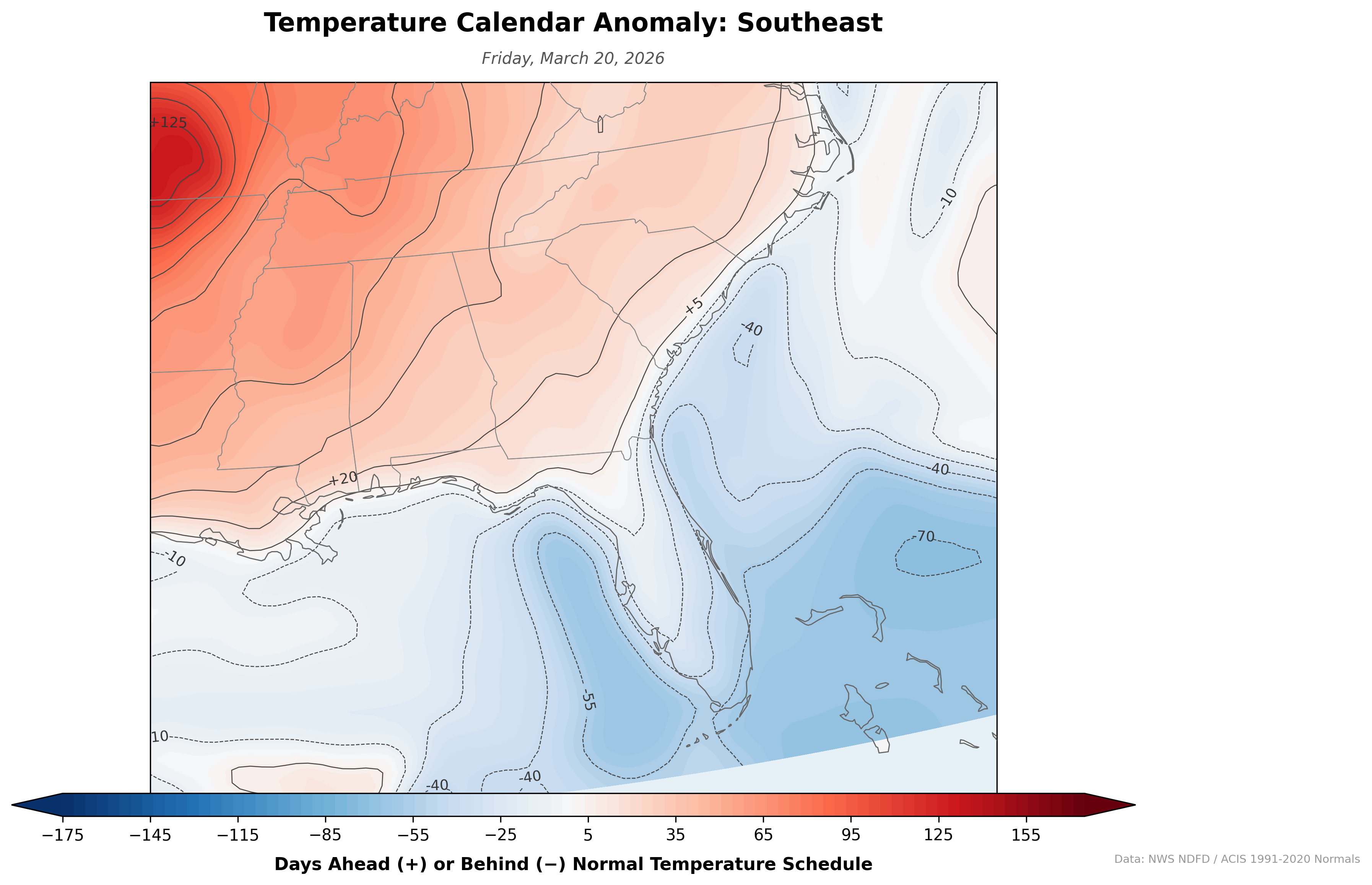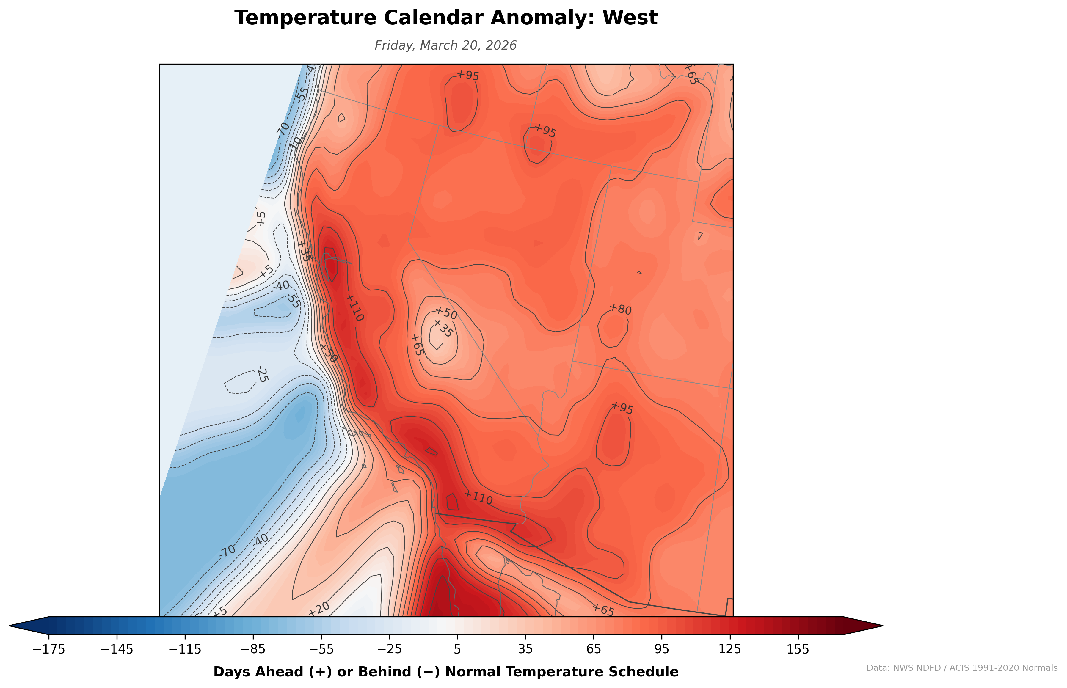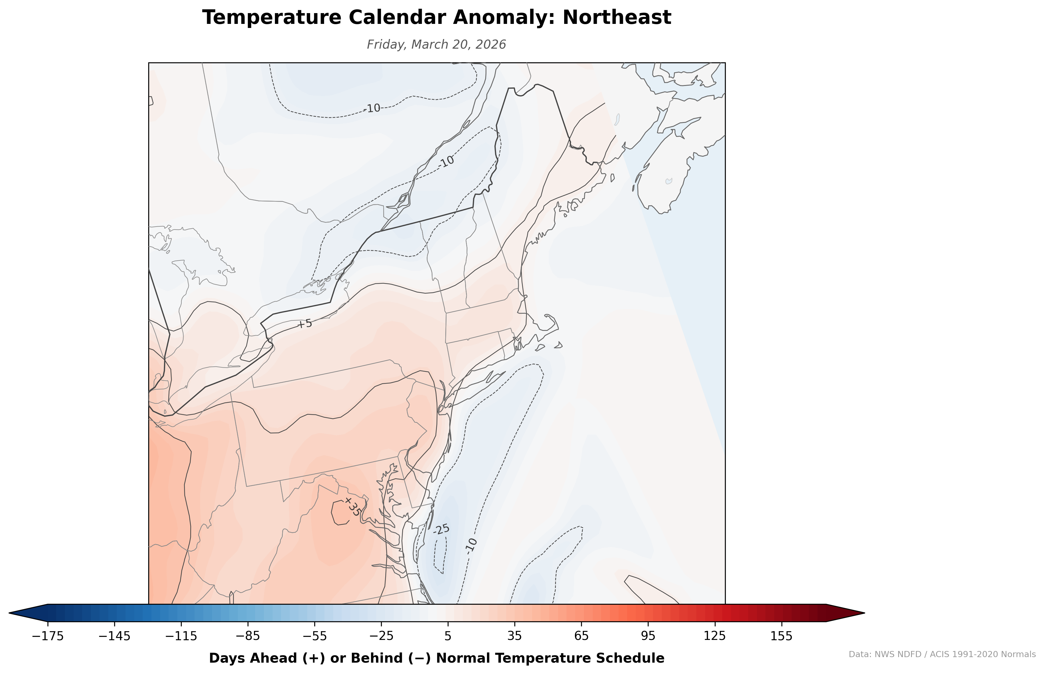 A daily-updating map that reframes temperature anomalies as time rather than degrees. Instead of showing "5°F above normal," it shows how many days ahead or behind the normal temperature schedule each location is. If the forecast high for July 1 matches the climatological normal for July 15, that spot shows +14 days — two weeks ahead of schedule.