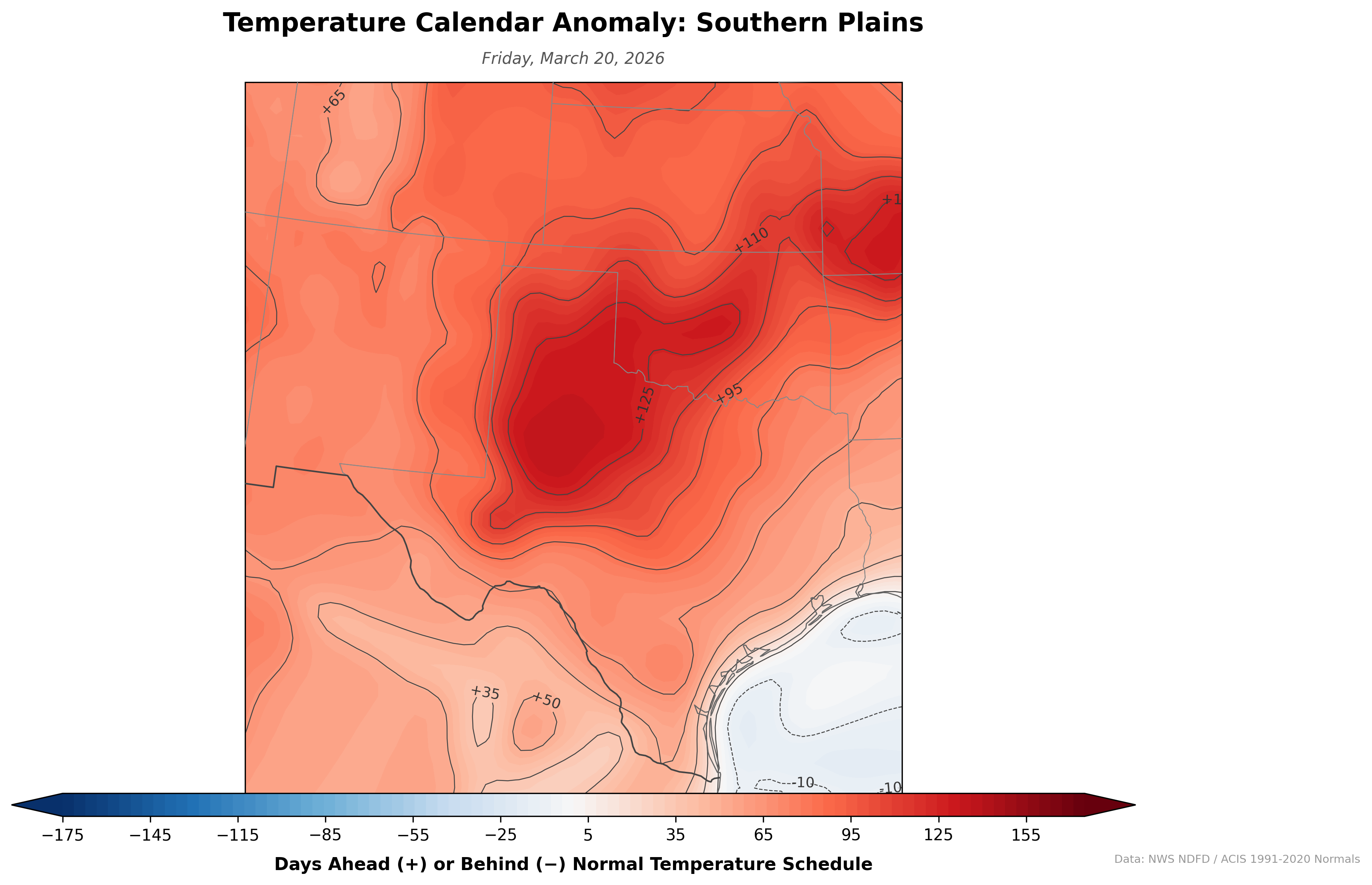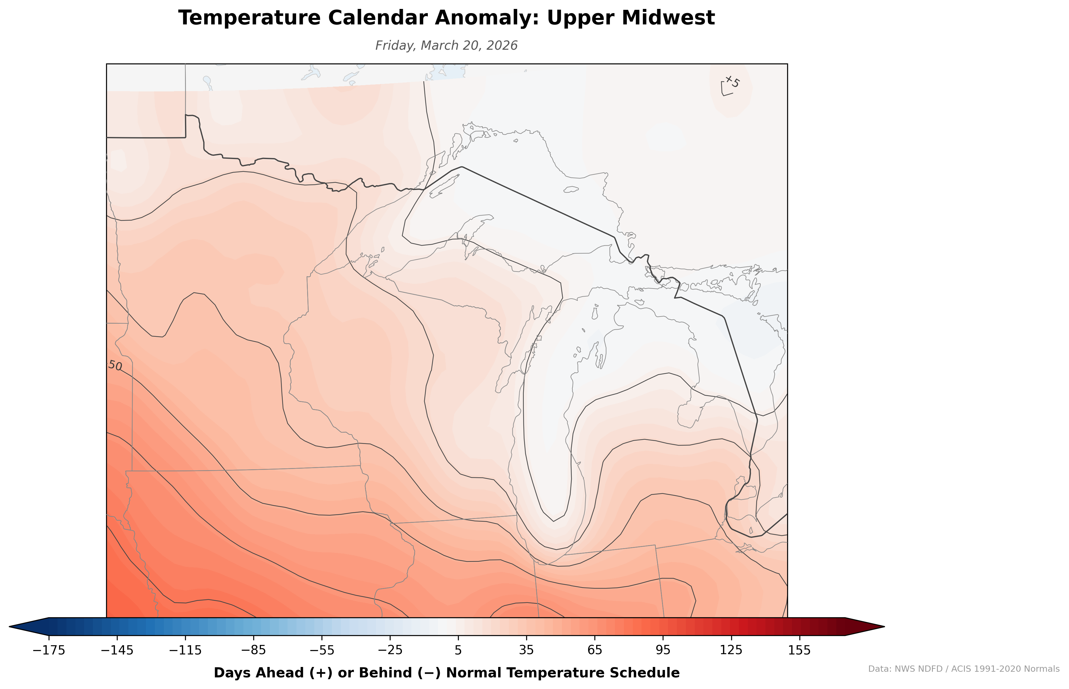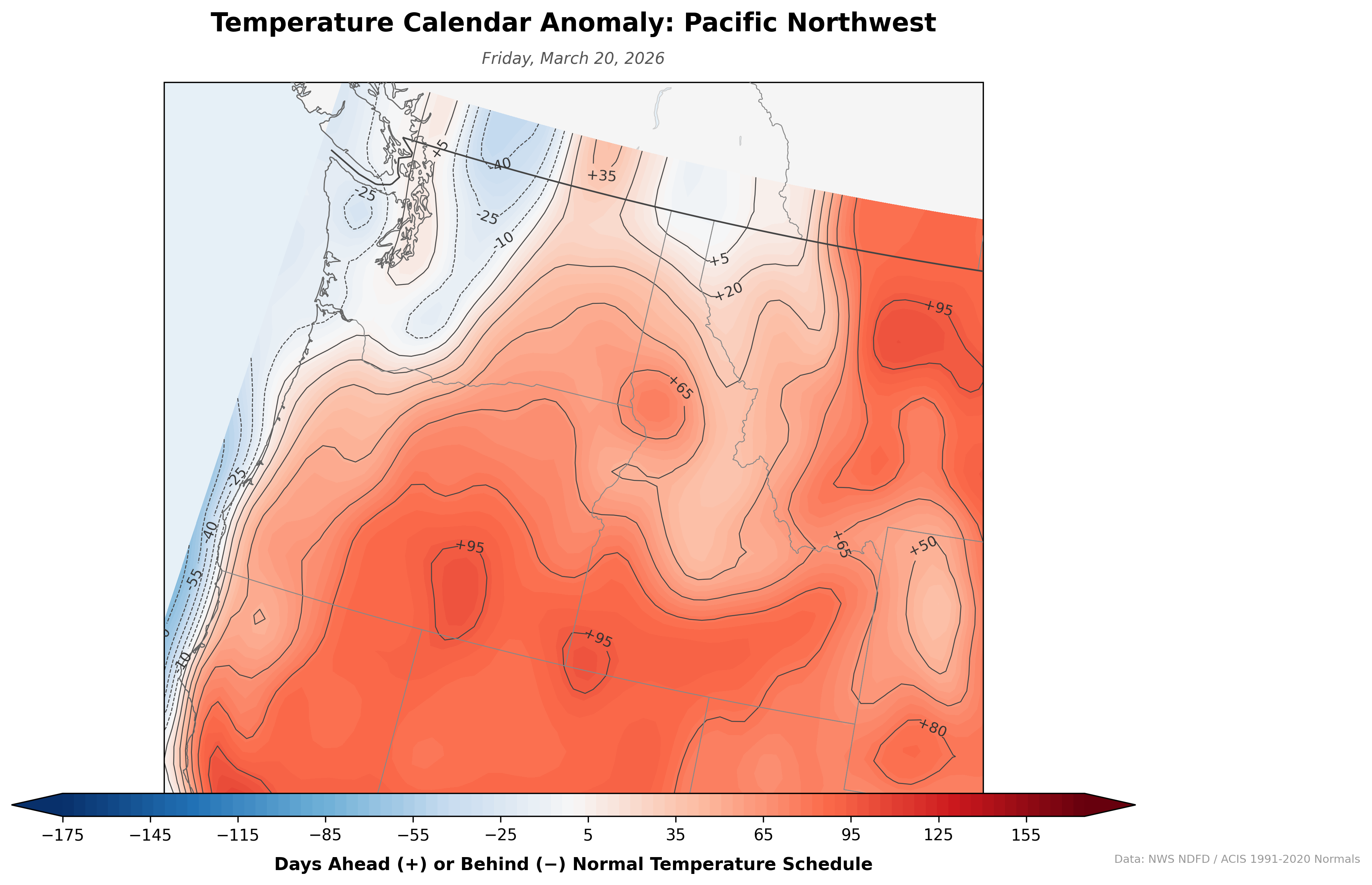 A daily-updating map that reframes temperature anomalies as time rather than degrees. Instead of showing "5°F above normal," it shows how many days ahead or behind the normal temperature schedule each location is. If the forecast high for July 1 matches the climatological normal for July 15, that spot shows +14 days — two weeks ahead of schedule.